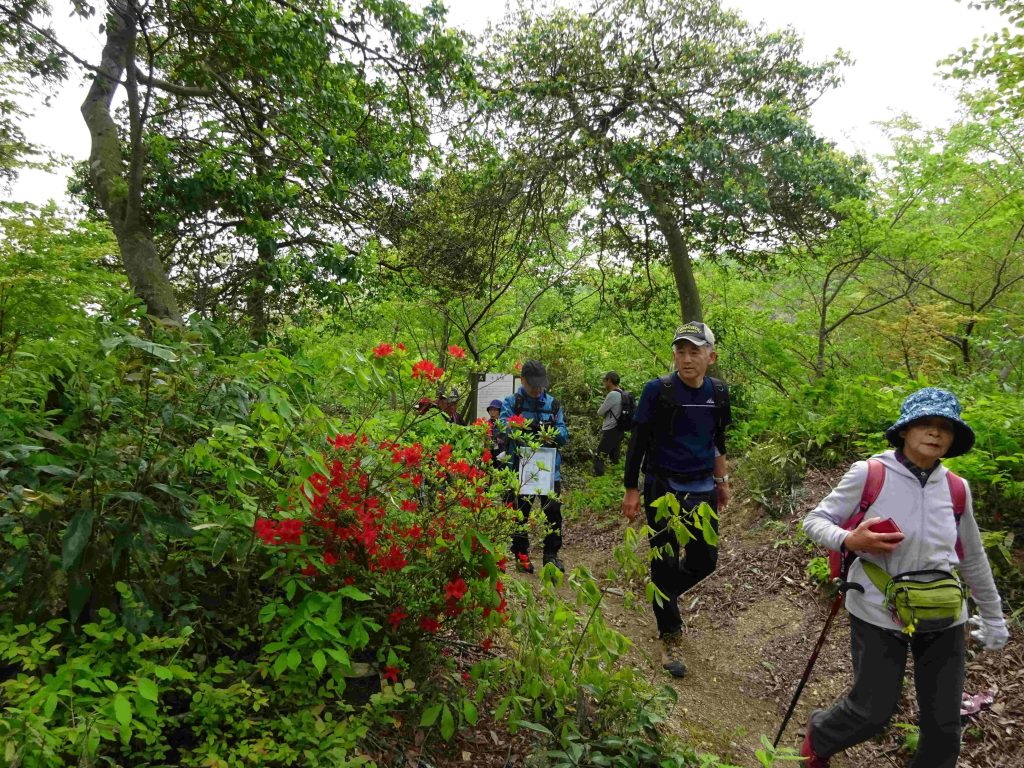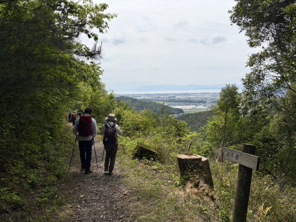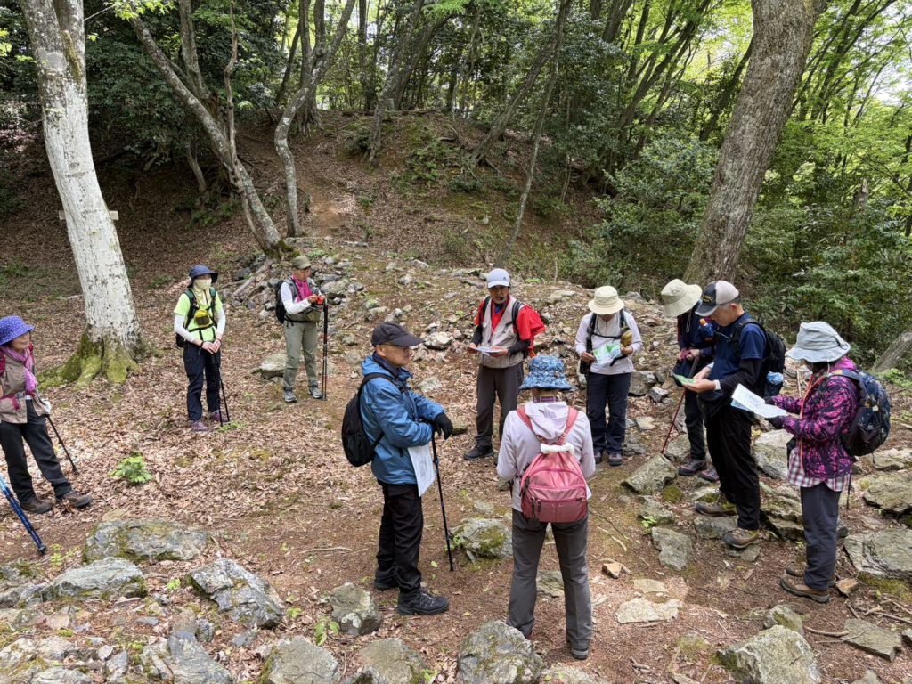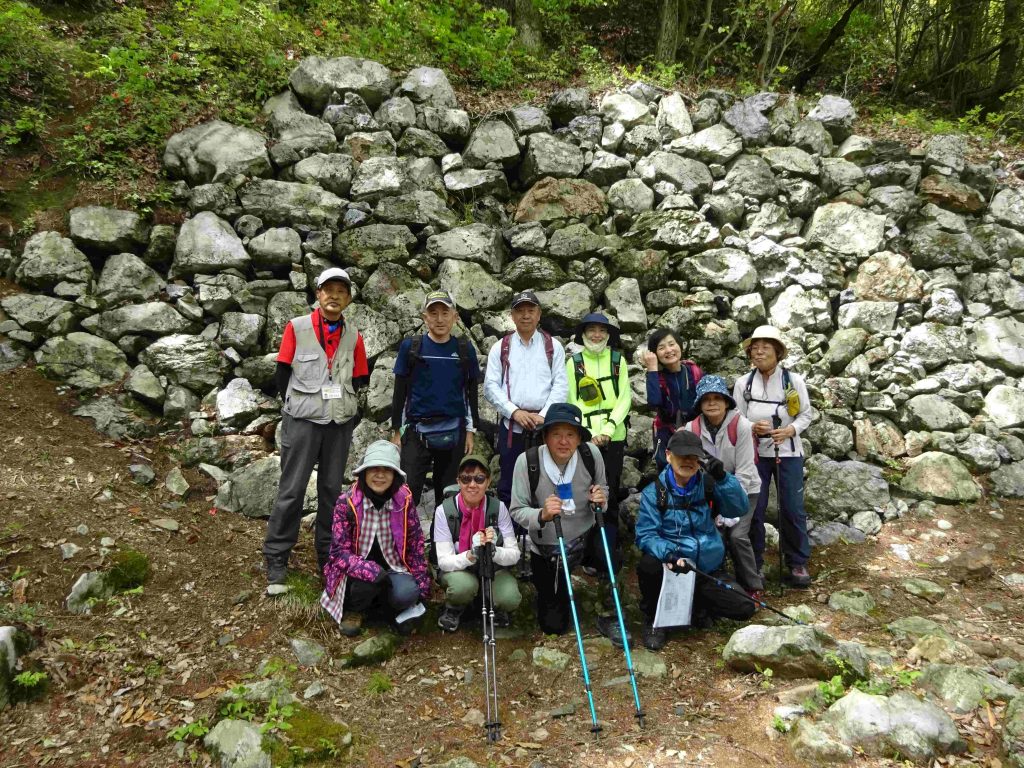このハイキングは自主企画の奥びわハイキングとあって参加者は小谷城ファンの方達10名の参加となりました。丁度、NHK大河ドラマ「豊臣兄弟!」では姉川大合戦から小谷落城に向かうというタイミングでもあり皆さんの興味は最高潮の雰囲気で河毛駅を出発。小谷城は石垣の城として注目され、浅井久政の「石垣用の石を運ぶ」古文書が再発見されたというニュースに、「山王丸の大石垣が非常に美しく見やすくなっています。今のうちにぜひ!」との中井先生のメールの披露もあって一層の盛り上がりです。そこで皆さんのご賛同を得て落城スペシャルとして山王丸・大石垣まで行くことになりました。まず小谷城戦国歴史資料館から番所へ、そして先週の大河ドラマの姉川合戦場、横山城をしっかり展望しました。桜馬場からは宮部村から虎御前山城まで信長が築いた軍道を展望しました。ドラマでは宮部村出身の宮部継潤が登場し、秀吉の調略により信長方に寝返ることになります。本丸を経て京極丸へ。京極丸では秀吉が攻め上がってきた虎口を探訪して、ここで昼食をとりました。午後は山王丸の美しい大石垣を鑑賞して記念写真を撮り、次の目的地へ向かうため資料館へ下山しました。ここから小谷郡上町の北国脇往還を散策しながら中島城へ到着。いま中島城はツツジが満開です。この城は丁野山城の出城的な存在で、主に朝倉軍が守備していましたが、大嶽城の落城と共に朝倉軍の本陣田上山へと逃げたのでした。こうしてドラマの舞台を踏破して大満足の中、予定通り河毛駅にゴールインし解散としました。